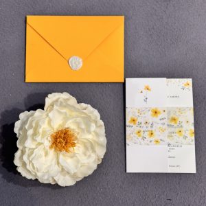 Un racconto che si svela, tra luce e trasparenze. La partecipazione della collezione Lovely Sun è un piccolo scrigno di dettagli: un invito pieghevole che accoglie i vostri ospiti con una frase personalizzata, avvolto in una delicata carta traslucida dai motivi floreali. Custodita in una busta giallo arancio dal carattere solare e sigillata con ceralacca bianca, è la sintesi perfetta dell'artigianalità firmata Effegi Lab.