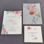 Il modello è composto da due fogli coordinati, racchiusi in una raffinata busta in carta traslucida decorata con motivi floreali, che lascia intravedere il contenuto creando un effetto visivo morbido e poetico. La chiusura è arricchita da un elegante timbbro in ceralacca, accompagnato da fiori secchi selezionati per richiamare i toni rosa pastello della partecipazione.