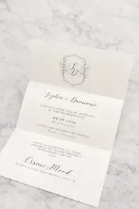 Partecipazione “Pocket Fold” elegante e moderna, realizzata con struttura a tasca interna che permette di organizzare in modo ordinato tutti i fogli informativi del matrimonio.