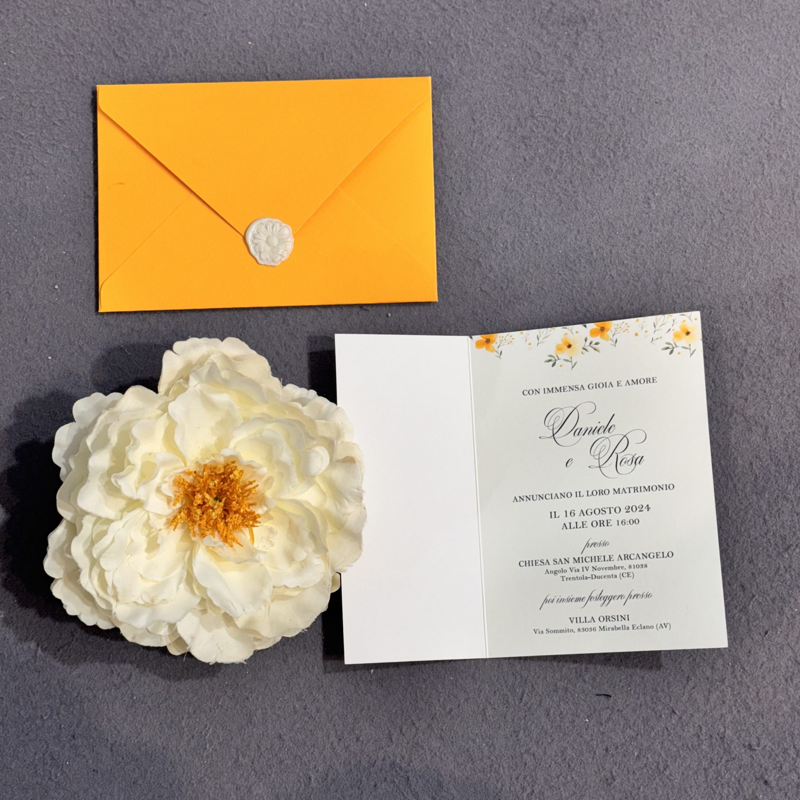 La Busta “Sole”: Il tutto è custodito in una busta di un vibrante giallo arancio, un colore caldo e solare che trasmette immediatamente l’energia e la gioia del vostro matrimonio.