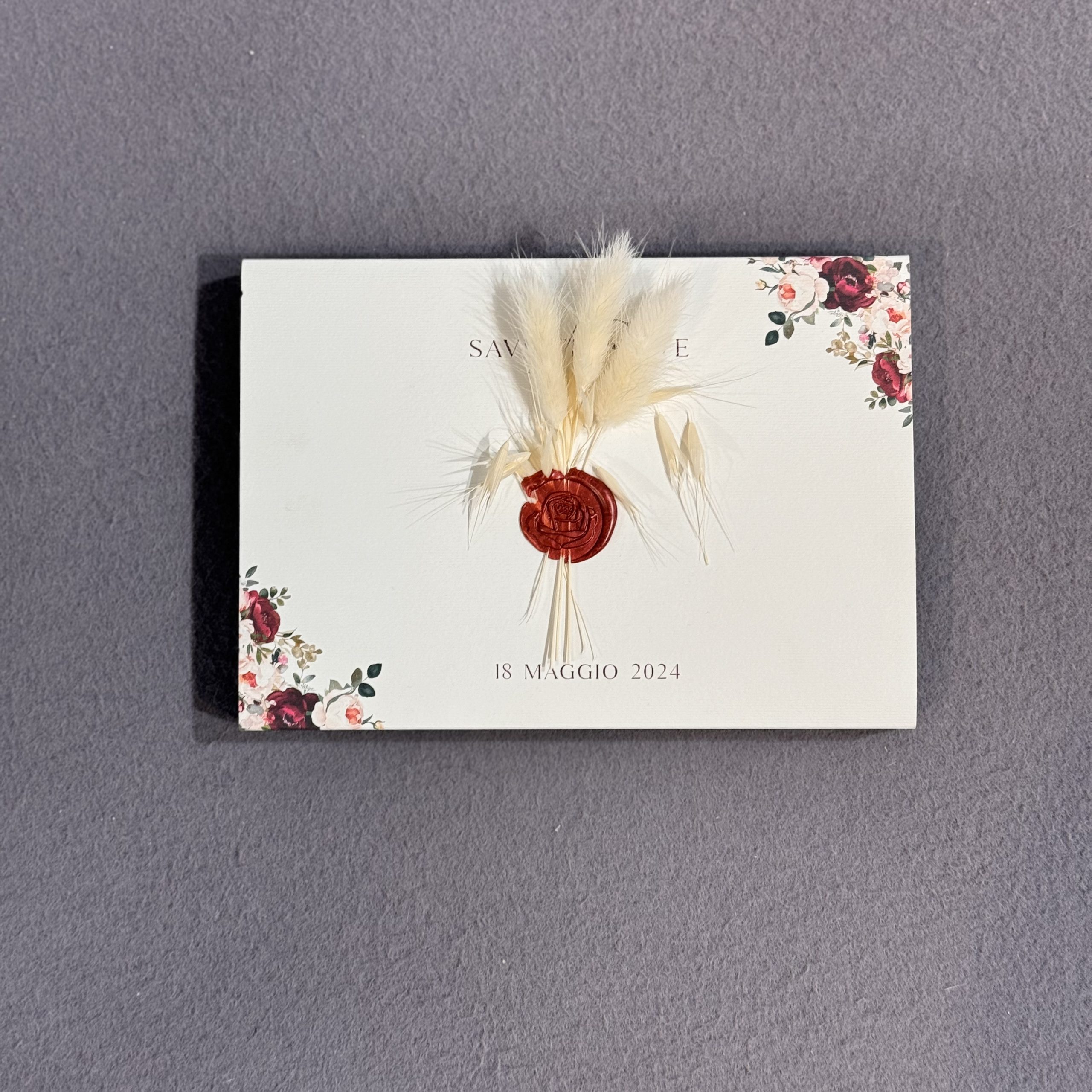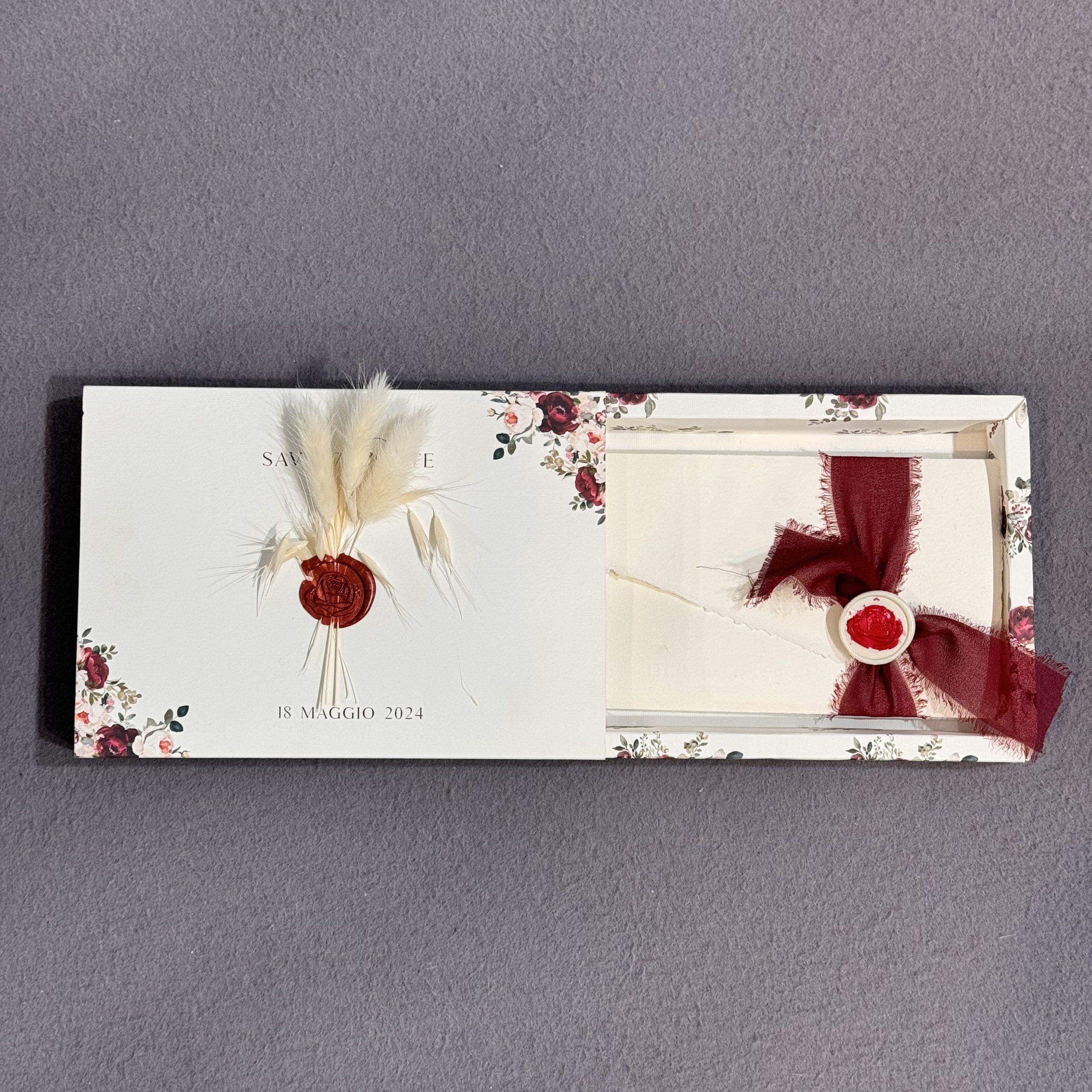 Composta da più inserti coordinati per cerimonia, ricevimento e dettagli dell’evento, impreziosita da un tag centrale con nomi degli sposi e nastro decorativo per una chiusura raffinata.