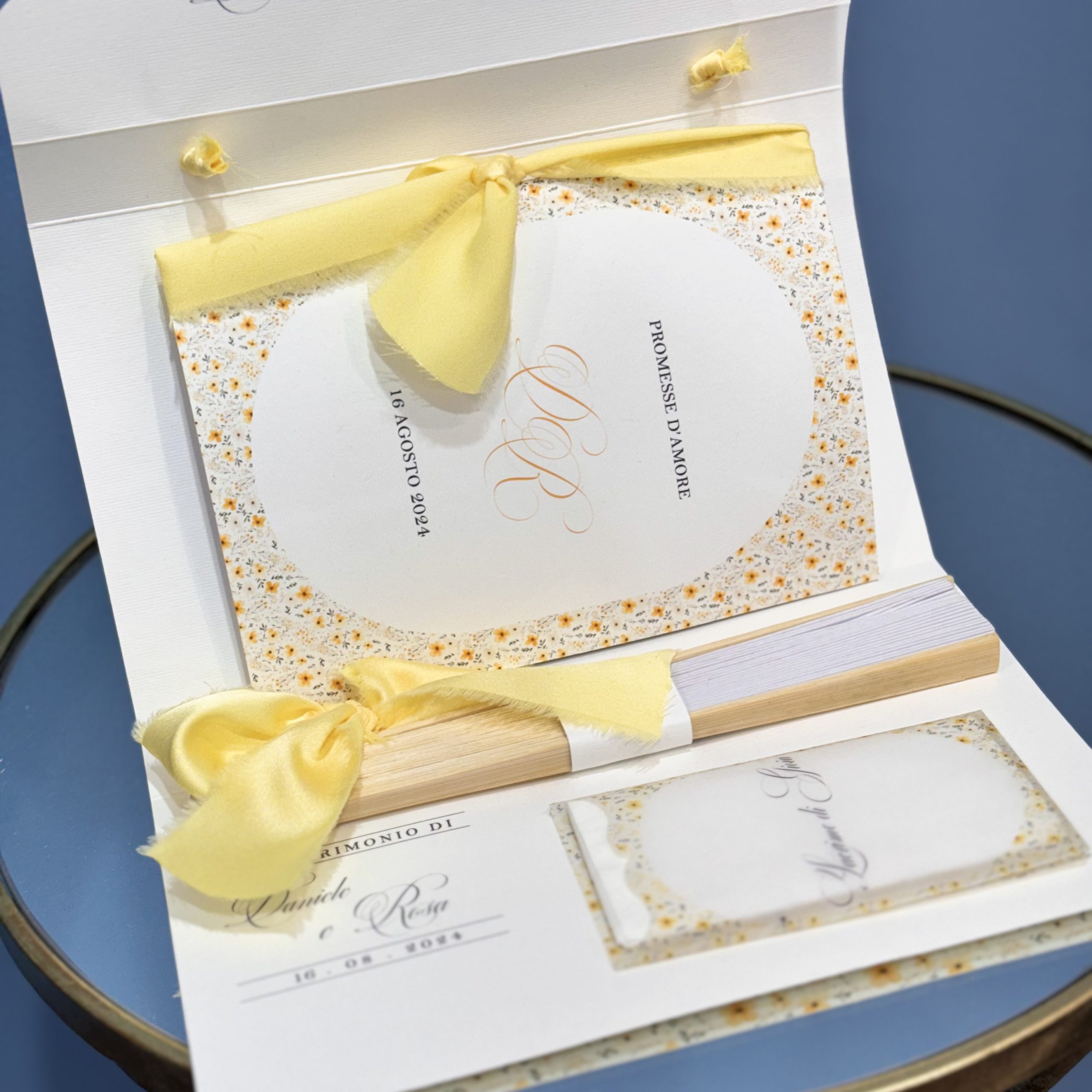 Libretto Messa (24 pagine): Un racconto curato di ogni momento della funzione. La copertina è realizzata in pregiata carta martellata, scelta per la sua texture ricercata, e rilegata a mano con un morbido nastro in chiffon o raso giallo.